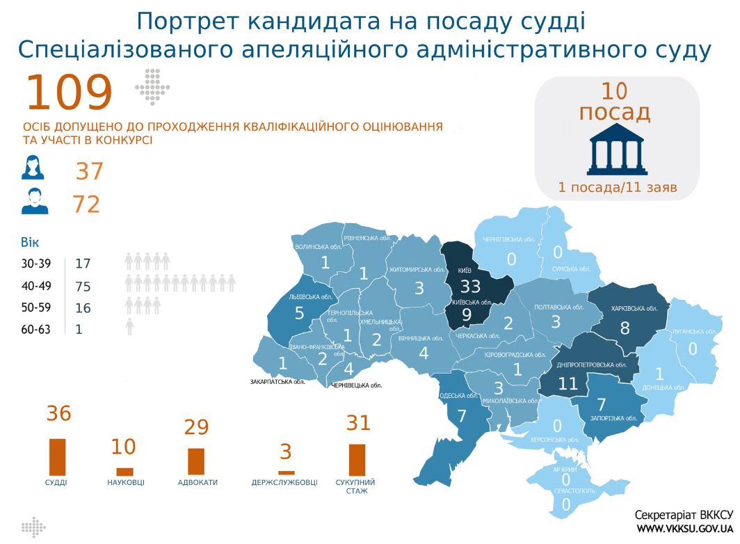 - 16 кандидатами підтверджено здатність здійснювати правосуддя (у Київському апеляційному суді – 3, Миколаївському апеляційному суді – 5, Одеському апеляційному суді – 5, Харківському апеляційному суді – 3);