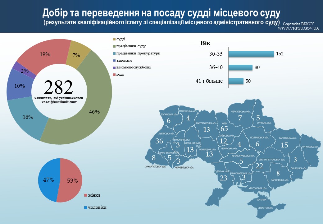 Найбільшу участь кандидатів на посаду судді забезпечили м. Київ, Львівська, Одеська, Дніпропетровська та Харківська області — загалом 57% від загальної кількості кандидатів.